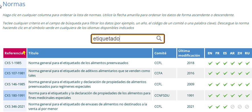- Se puede bajar las normas codex, en el siguiente link, dar clic al idioma deseado (√): https://www.fao.org/fao-who-codexalimentarius/codex-texts/list-standards/es/